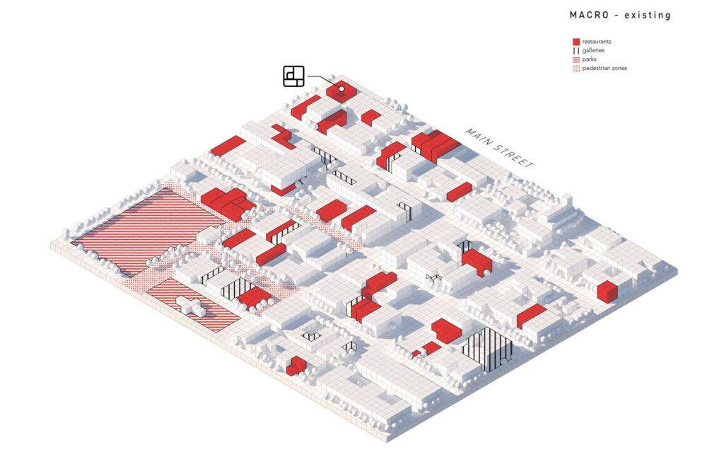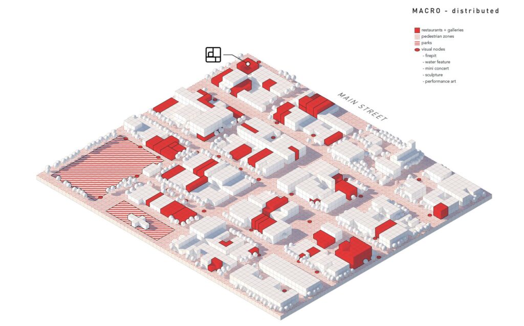 • Macro – Focused on the 16 block grid of a “resort town” that currently contains nearly 30 restaurants, we have marked locations where people can disperse at 6 FT modules with their take-out food throughout visual nodes such as fire pits, water features, music and art presentations, and use of galleries for enjoying meals.