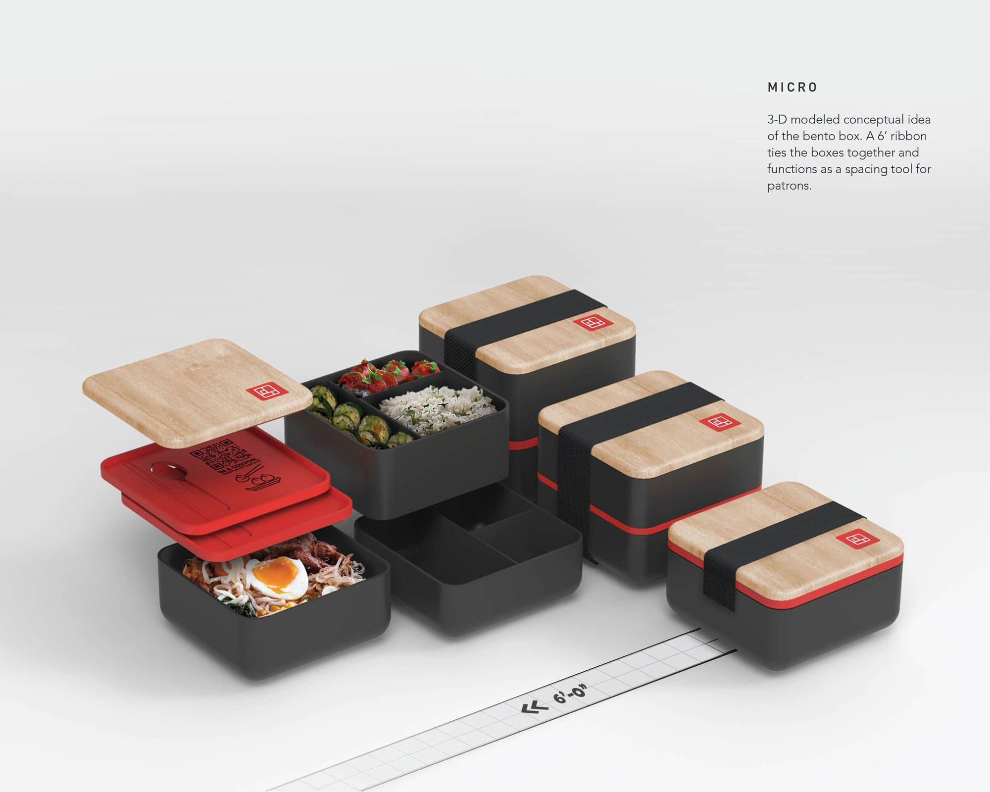 • Micro – Patrons who want the culinary experience but prefer more distancing, can pick up our designed bento box serving system allowing the restaurant experience to be taken out on the town or home. Technology is embedded into the bento box for tracking, including a coupon for when it is returned. A 6 FT ribbon ties the boxes together and functions as a spacing tool for patrons.