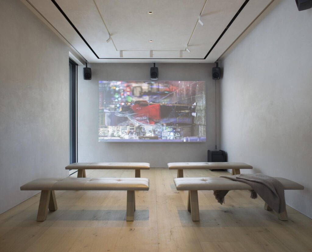 A consistent interior palette features natural materials, meticulously detailed with special attention to the precision of alignments. The great room is designed for maximum flexibility with furniture easily removed for large dinner parties, musicals, and other philanthropic events. Two gallery spaces, one on each level, are designed to display a vast range of video art arrangements based on how an artist conceives a piece should be experienced. In addition, the auto court doubles as a pre-function space, where guests can enter through large, fully pocketing windows.
